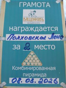 Представители прекрасной половины Института филологии КФУ им.В.И.Вернадского по-разному отметили Международный женский день. Заведующая кафедрой английской филологии Полховская Е.В. 8 марта 2026 года приняла участие в турнире по бильярду «Комбинированная пирамида». Елена Васильевна в упорной борьбе с опытными соперниками-мужчинами заняла 2-е место (https://vk.com/wall-202164931_44903)!