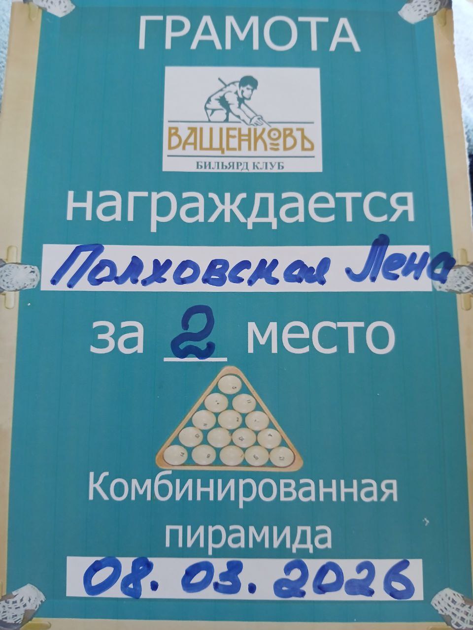 Доцент Полховская Е.В. давно увлекается этим видом спорта. По ее словам, игра в бильярд помогает ей тренировать концентрацию внимания и стратегическое мышление, которые так необходимы в научно-педагогической деятельности. Елена Васильевна сердечно поздравляет женщин-коллег с 8 марта и советует погрузиться в удивительный мир бильярда!